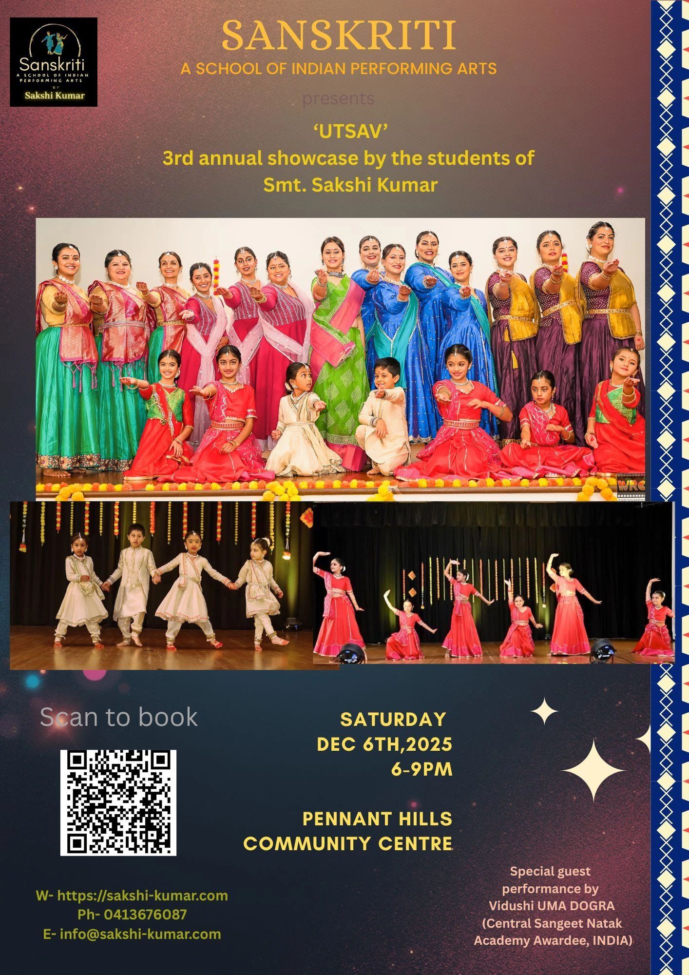 UTSAV- 3rd Annual festival of SANSKRITI at Pennant Hills Community Centre on 6th Dec,2025. https://www.trybooking.com/DGHJZ
